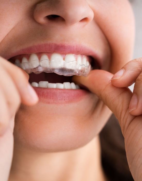 Invisalign® uses a series of custom-made, transparent aligners that gently shift your teeth into their ideal position. These clear aligners are virtually invisible, removable, and designed specifically for your smile transformation.